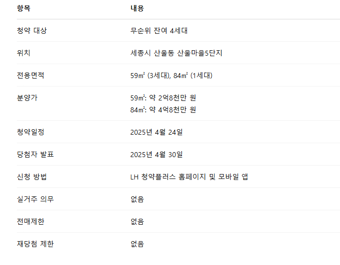 2025년 4월 24일, 세종시에서 투자자와 실수요자 모두의 관심을 받을 만한 무순위 청약이 진행됩니다. 바로 세종 산울마을5단지 ‘세종 파밀리에 더파크’ 잔여 세대에 대한 무순위 줍줍 청약입니다.이번 글에서는 청약 자격부터 분양가, 시세, 신청 방법까지 전반적인 정보를 자세히 정리해드리겠습니다.