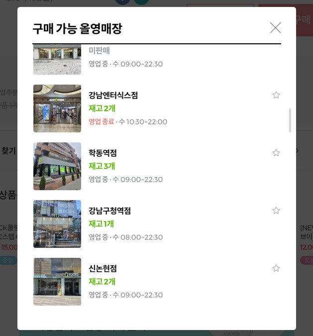 - 올리브영 공식 홈페이지 또는 앱에서 제품명 검색 → ‘매장 재고 조회’ 클릭